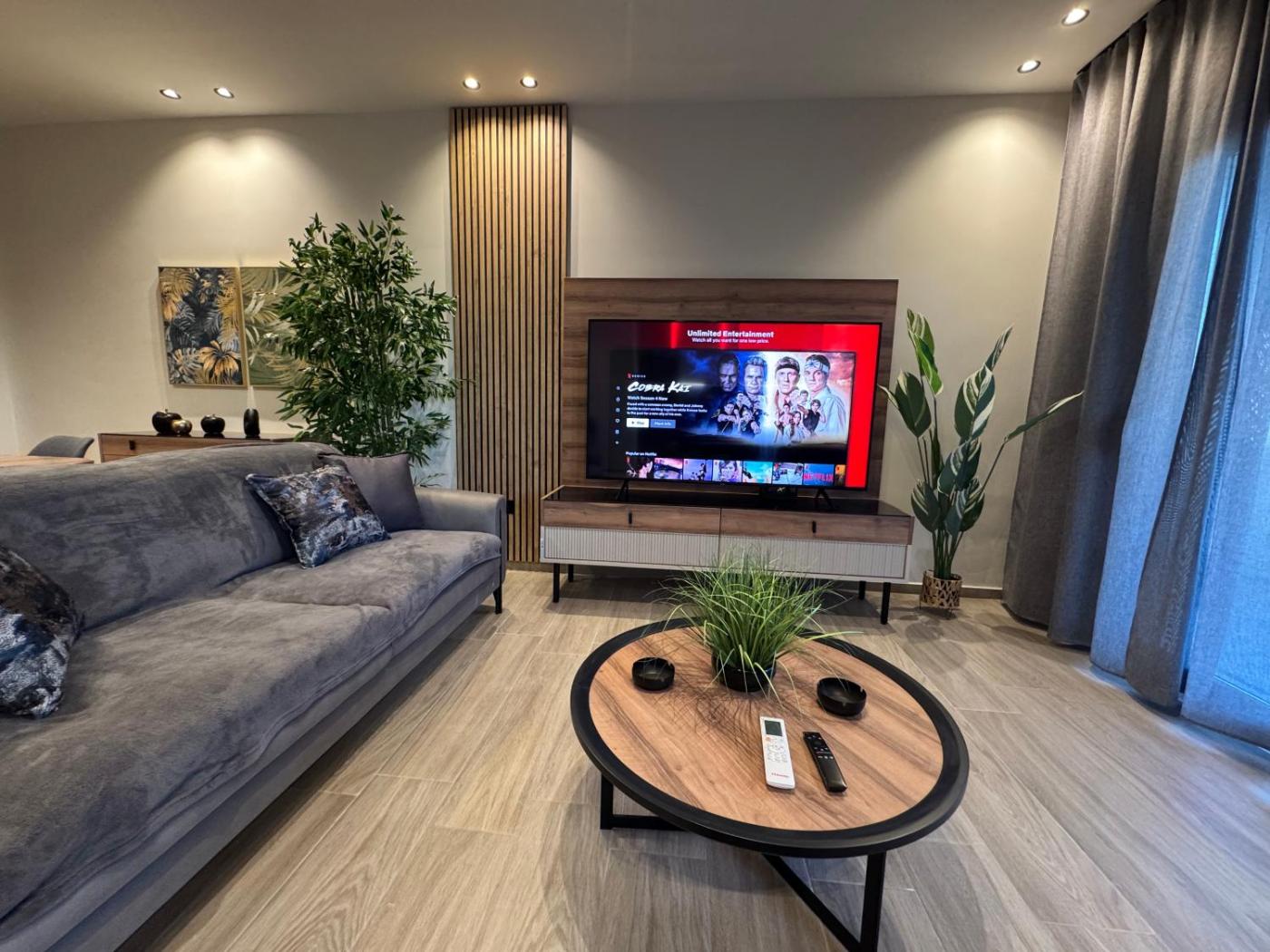Three-Bedroom Deluxe Apartment. Boasting 3 bedrooms, this spacious apartment has 2 bathrooms with a walk-in shower, a seating area and terraceyou can relax. In the well-fitted kitchen, guests will find a stovetop, a refrigerator, kitchenware and an oven. The air-conditioned apartment offers a flat-screen TV with streaming services, a washing machine, soundproof walls, a tea and coffee maker as well as garden views. The unit offers 4 beds.